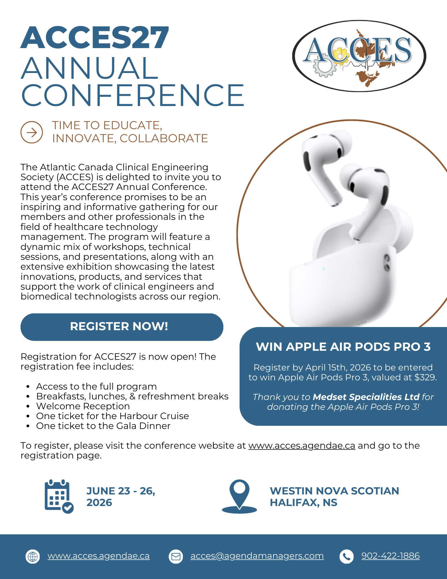 Register before April 15th 2026 to be entered to win a set of Apple Air Pods Pro 3, donated by Medset Specialties Ltd.